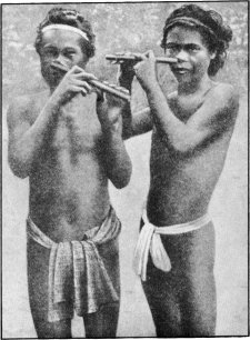 Among various primitive accomplishments of the Sakais, that of music-making by means of blowing with their nostrils through a reed-pipe is not the least remarkable, and their delight in the two or three weird notes thus produced is unbounded. Norm (right) joins in the fun and dresses for the occasion. (Norms old photo archives)